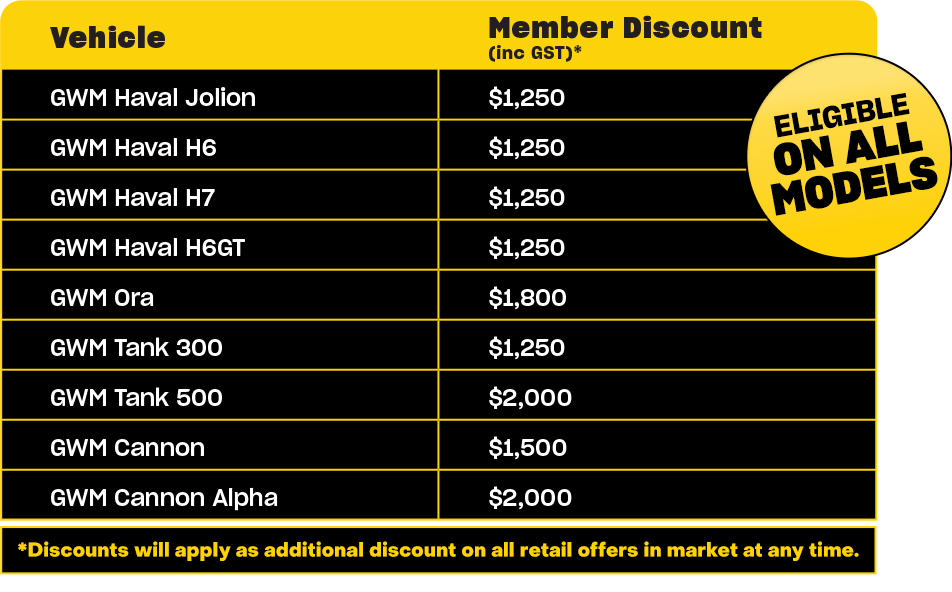 To redeem, Richmond members who have a valid membership* simply need to visit your local GWM dealership and ask for the offer to be applied to the vehicle of your choosing.
