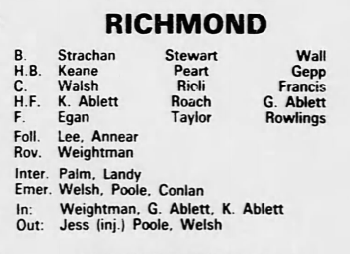 As a result, Ablett’s last game for Richmond was Round 21, 1984. Fittingly he took the field alongside brother Geoff as they battled Geelong, which included brother Gary.
