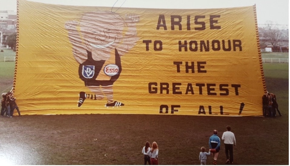 He also helped with those incredible alliterative banners that would snake around the southern and western stands. Remember “Ruthless Richmond – Esso Tigers, our powerful premiership predators”, that was one of his.
