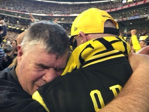 David Norman and Gerard Egan embrace after the drought-breaking 2017 Premiership
