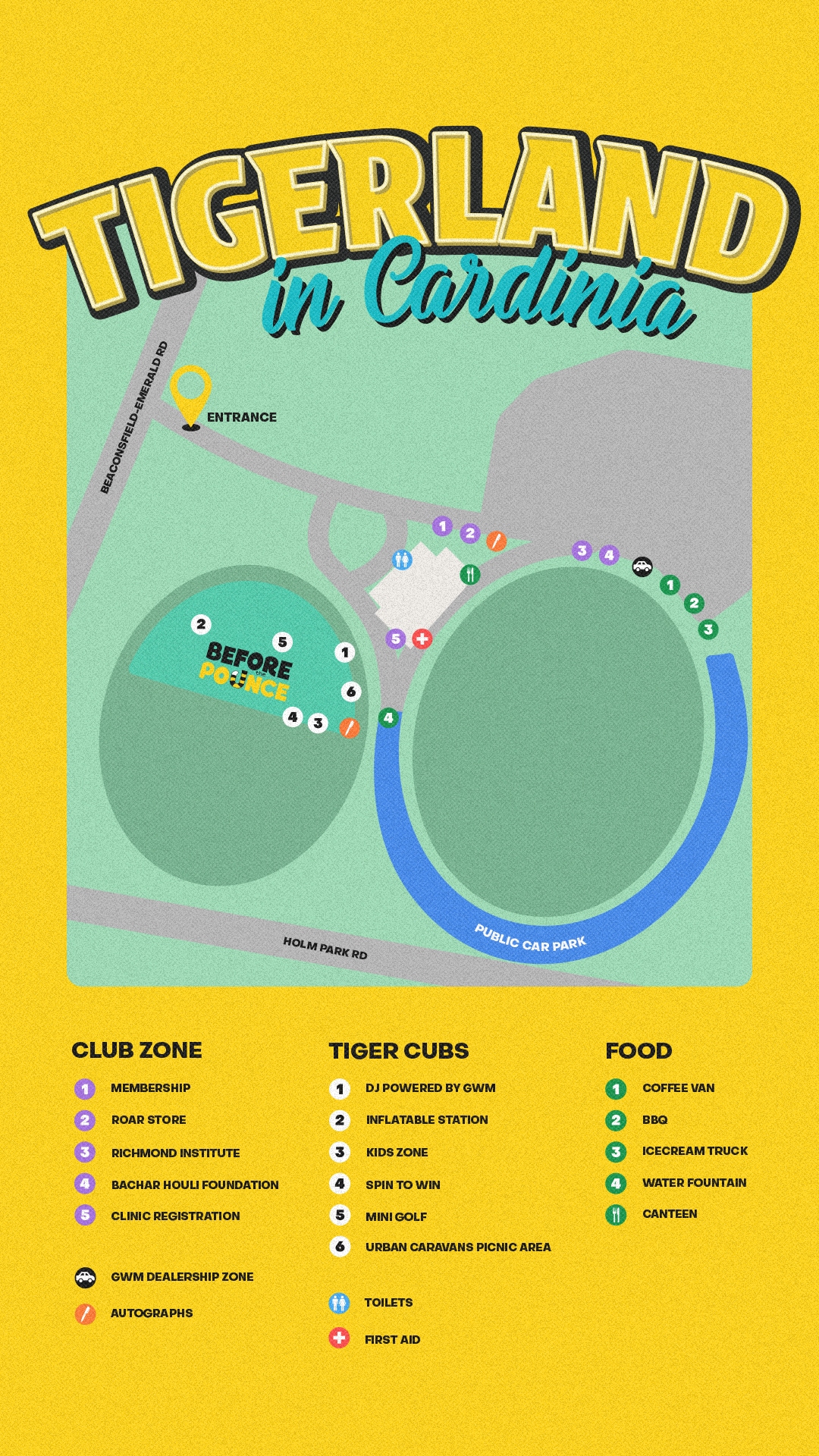 *Parking behind the goals is at the vehicle owner's risk. Please be mindful of stray footballs that may hit your windscreen throughout the event.