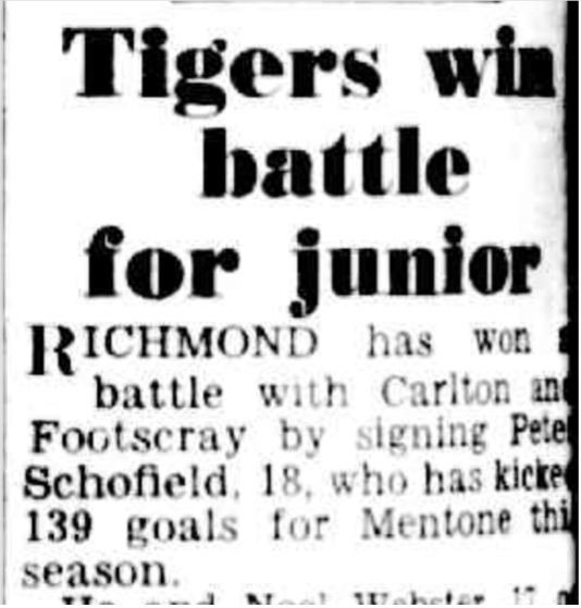 One of only a handful of players to be coached by Jack Dyer and Norm Smith, Schofield first caught the eye of the Tigers during the 1950 season after booting 100 goals from 12 games for Mentone in the Federal League.