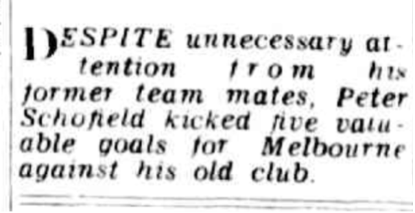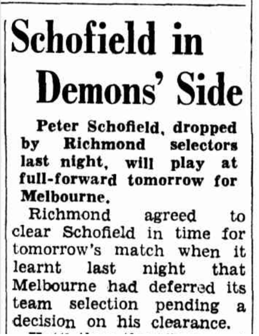 Everything came to a head that week and Richmond officials sensationally swapped him for Demon key position player Frank Dunin. Schofield took the field in Round 10, for Melbourne.