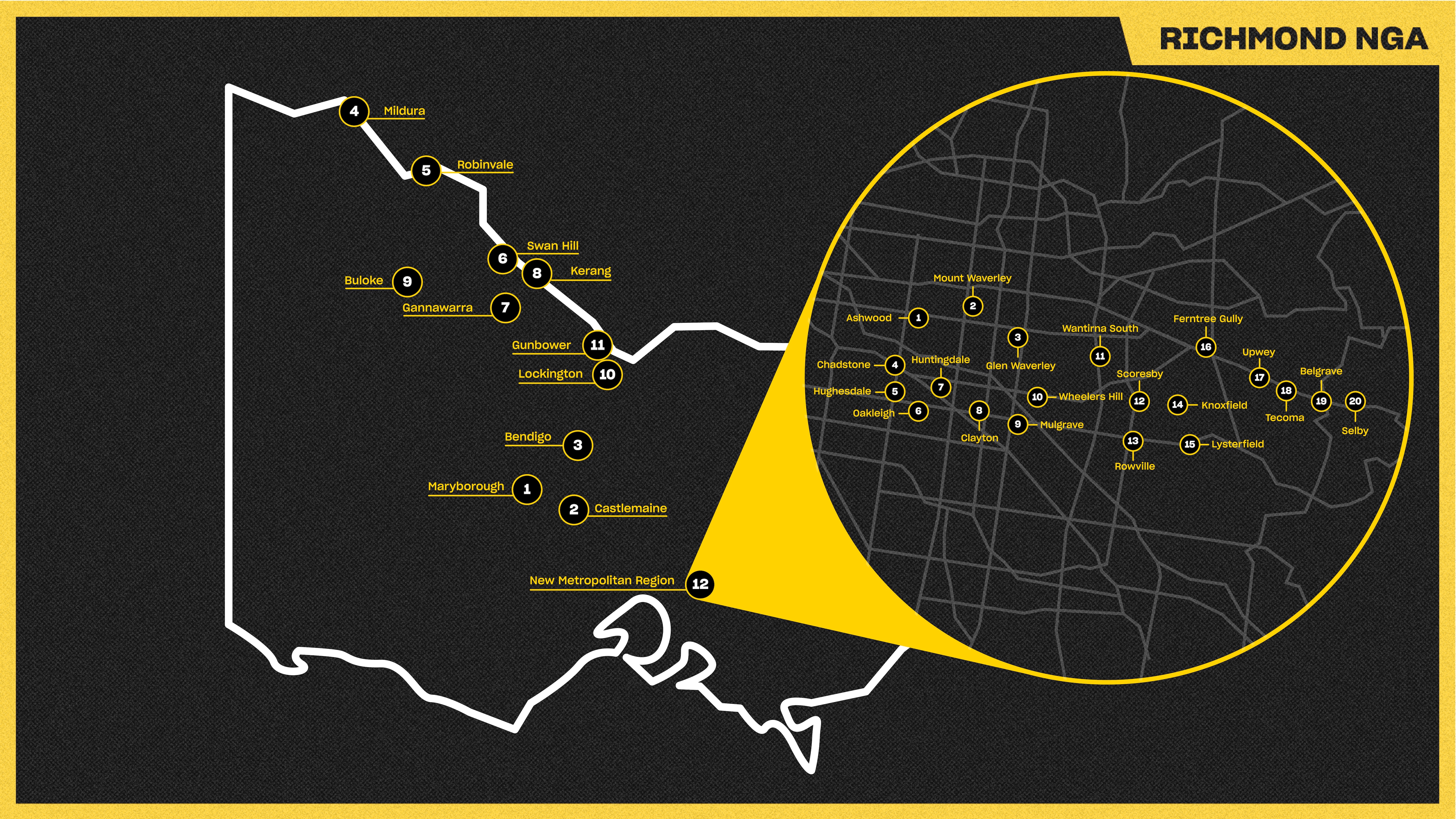 The Tigers’ updated NGA zone now includes a new Melbourne metropolitan region which stretches from Chadstone to Selby. This complements the current regional zones, which spans across Castlemaine to Mildura.