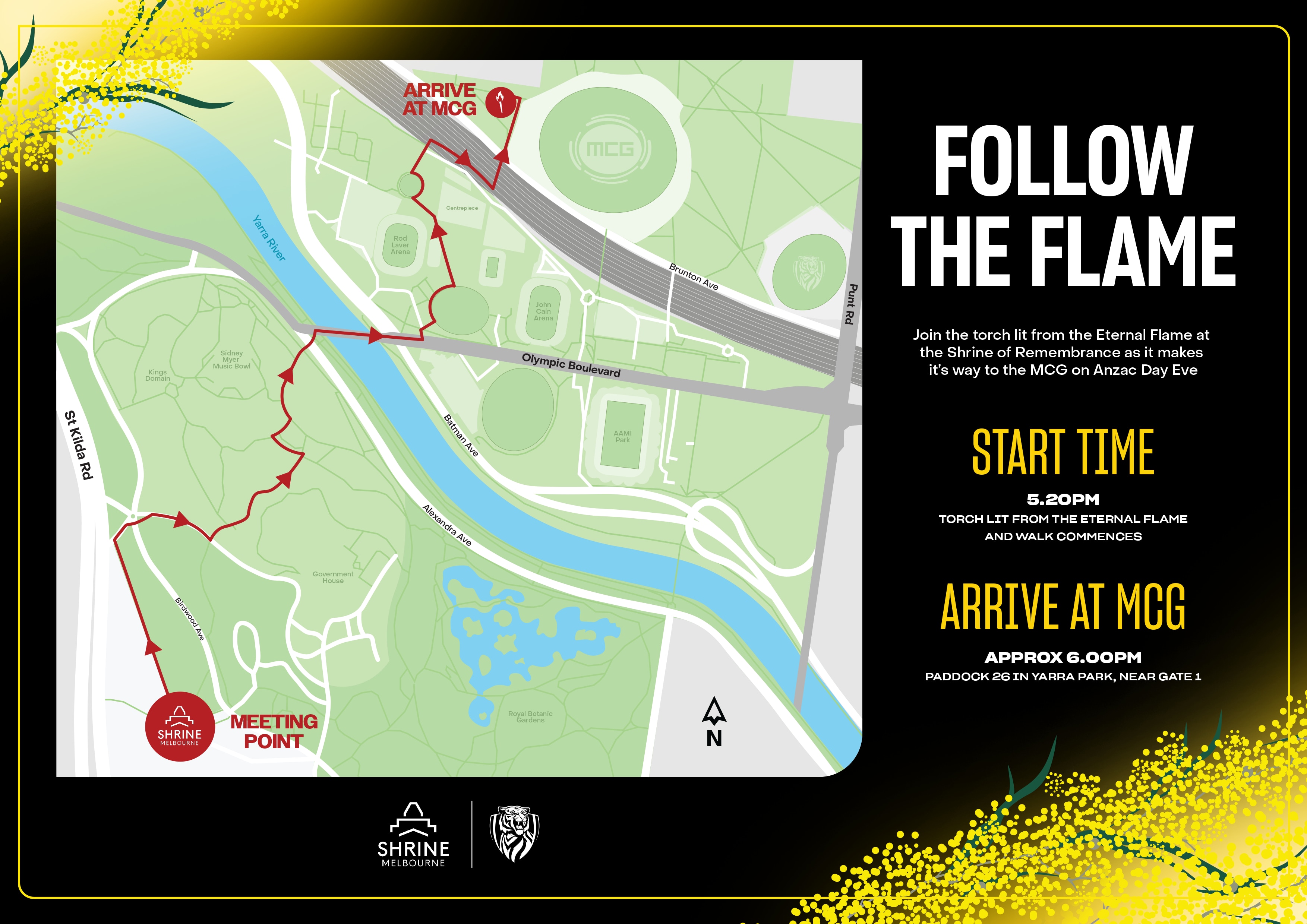From 5:20pm Friday evening, Richmond fans are encouraged to 'Follow the Flame' and join the torch lit from the Eternal Flame at the Shrine of Remembrance as it makes its way to the MCG ahead of the traditional Richmond v Melbourne Anzac Day Eve clash.