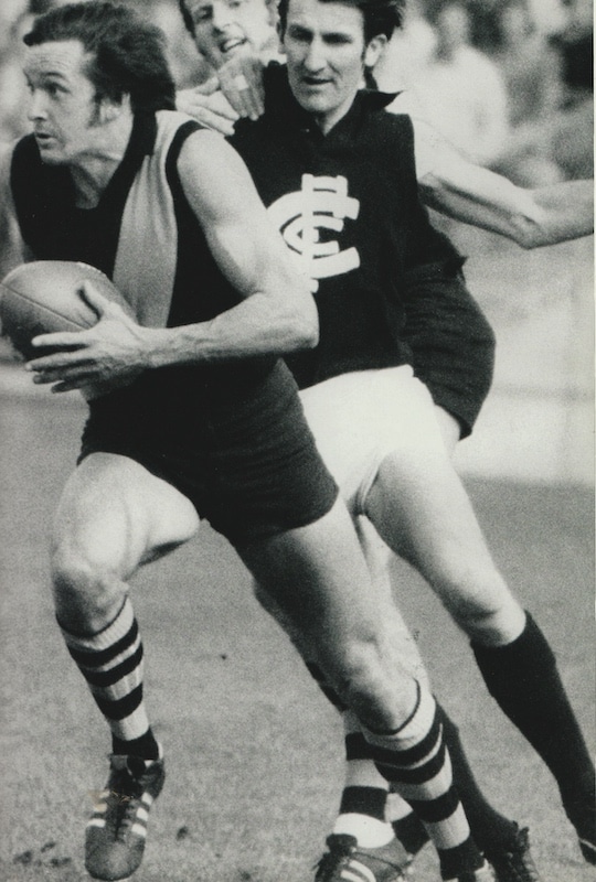 “But I reckon I learnt more in that first game than I did for the next six months. Just the fact that whenever he got the ball he did something with it and he was in the packs pushing and shoving and leading his charges on. He was just a classic player. Not that you’d stand back and watch him, but you’d think, “Shit, that was good.” The club persisted with me even though I was pretty slight, keeping me at centre half-forward and full-forward for the rest of the season.”